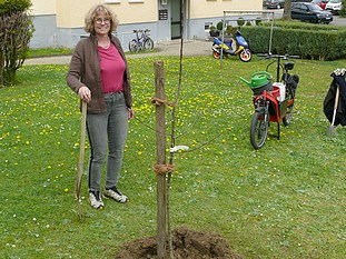 (06.05.2022) Netzwerkmitglieder haben im Steingraben / Ecke Wacholderweg zu Spaten und Hacke gegriffen und zwei weitere Apfelbäume gepflanzt.