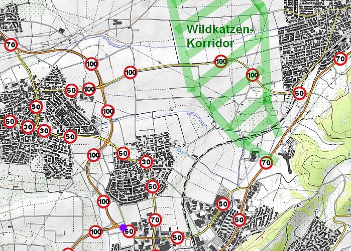 Straßen verhindern Biotopverbünde. Zumindest Geschwindigkeitsbeschränkungen müssen angeordnet werden. Leider tut sich Herrenberg schwer. Zwischen Kuppingen und Nufringen hat der BUND im Jahr 2017 einen "Wildkatzen-Korridor" angelegt (Umwidmung ehemals landwirtschaftlicher Flächen zu Brachland; es wurden viele hundert Büsche gepflanzt). Die K1068 zwischen Kuppingen und Nufringen durchschneidet das Gebiet. Erlaubt ist Tempo 100. Die netten Schilder "Achtung Wildkorridor" werden niemanden abhalten, die 100 auszufahren.Besonders nachts wird gerast.