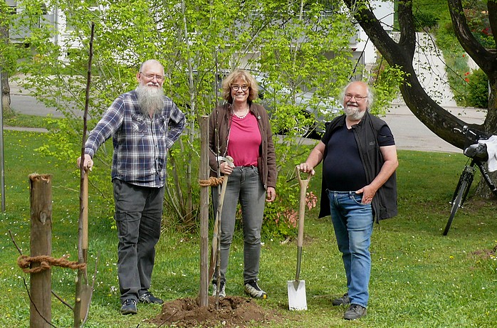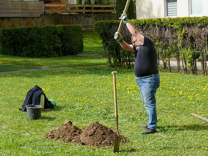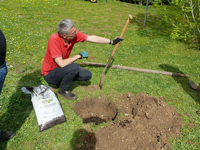 … da sollte man auch der Natur wieder zu ihrem Recht verhelfen. So zumindest sehen das einige Engagierte in der Schwarzwaldsiedlung. Als kleinen Schritt in die richtige Richtung hat man, zwar nicht am Tag des Baumes, aber kurz danach im Steingraben / Ecke Wacholderweg zu Spaten und Hacke gegriffen. Es ging darum, zwei weitere Apfelbäume auf städtischem Grund fachgerecht zu pflanzen. das TUG (Amt für Technik, Umwelt, Grün) hatte auf Anregung der Gruppe schon vor ein paar Wochen auf dem städtischen Grundstück einen weiteren Blühstreifen eingesät. Beides soll mit dazu beitragen, dass Insekten und Vögel auch künftig Nahrung und Lebensraum im immer dichter besiedelten Stadtgebiet haben.