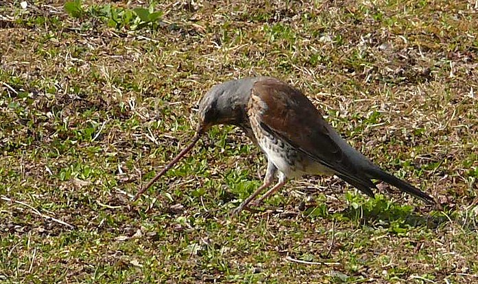 Übrigens, die während des Fototermins im Gras aktive Singdrossel (nein, keine Wacholderdrossel, wenn auch am Wacholderweg!) stochert nicht etwa mit dem Stöckchen im Gras. Vielmehr stemmte sie sich über Minuten wie ein Angler gegen den Wurm, den sie schließlich in ganzer Länge aus dem Boden zog, immer wieder nachfassend. Danach wurde der dann genüsslich verspeist!