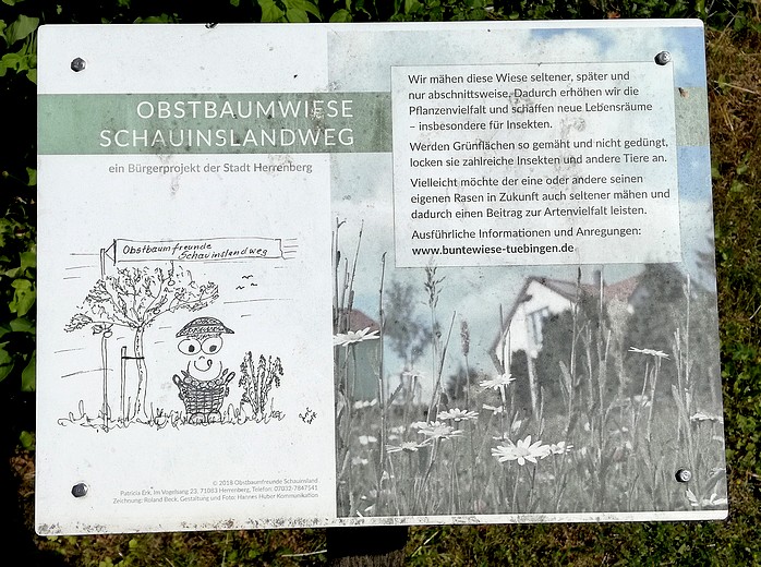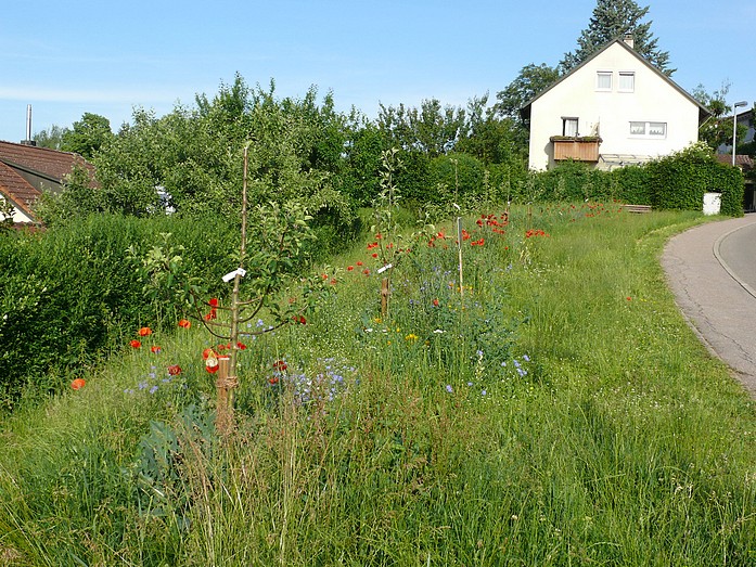 Vor gut drei Jahren haben engagierte Bürgerinnen und Bürger in der Schwarzwaldsiedlung begonnen, dem Insektensterben vor der eigenen Tür entgegenzuwirken. Ein schmaler Grünstreifen entlang des Schauinslandweges wurde aus dem Mähplan der Technischen Dienste herausgenommen und von den Obstbaumfreunden Schwarzwaldstraße selbst gemäht. Neben wildwachsenden Kräutern und Gräsern sind nun auch die ersten Bäume angewachsen. inzwischen kümmert sich die engagierte Gruppe um ein weiteres Stückle und hat aus dem kahlen Rasen an der Schwarzwaldstraße eine Streuobst- und Blütenwiese gemacht.